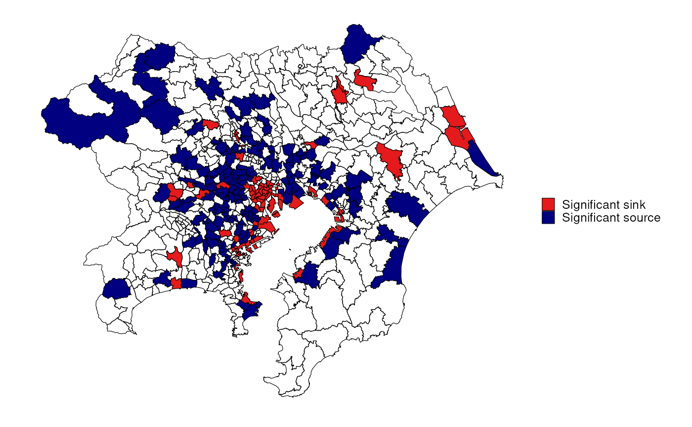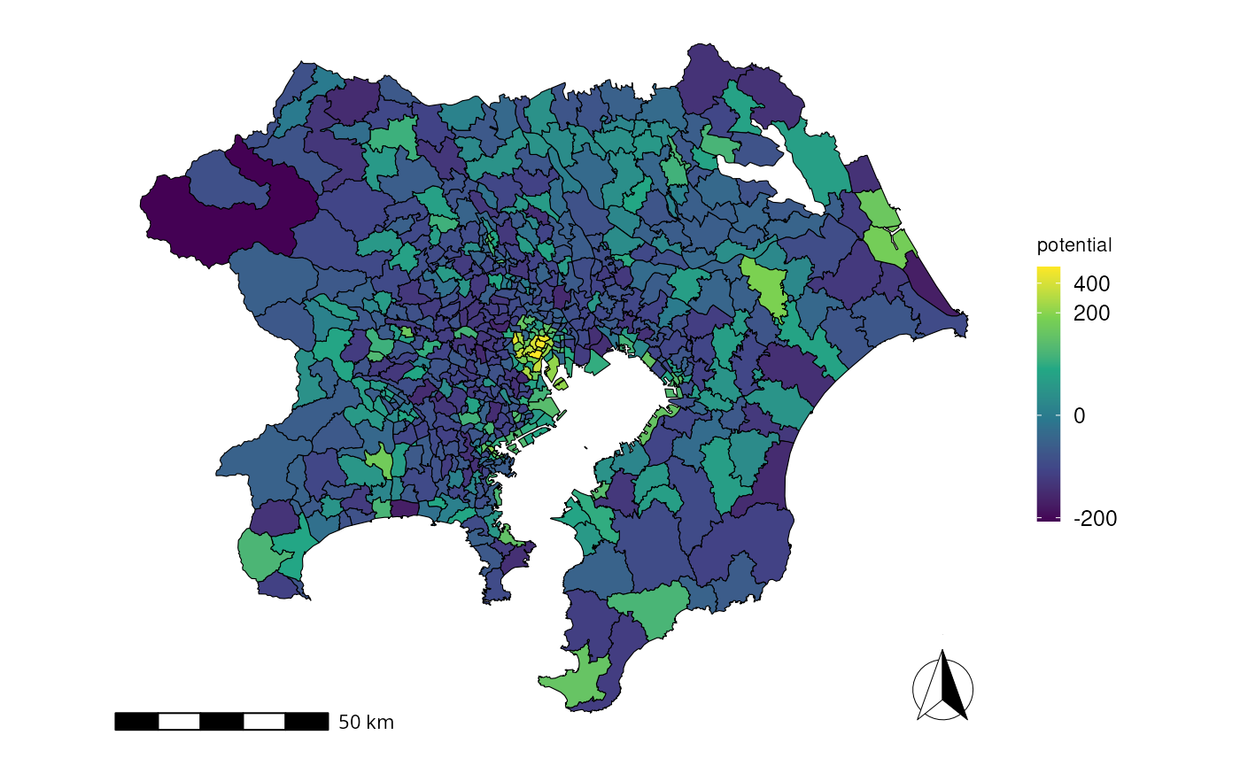 #> Calculating p-values by monte calro (100000 steps). thread = 32We plot the potential on a map using a shapefile publicly available from the Tokyo Metropolitan Region Transportation Planning Commission.